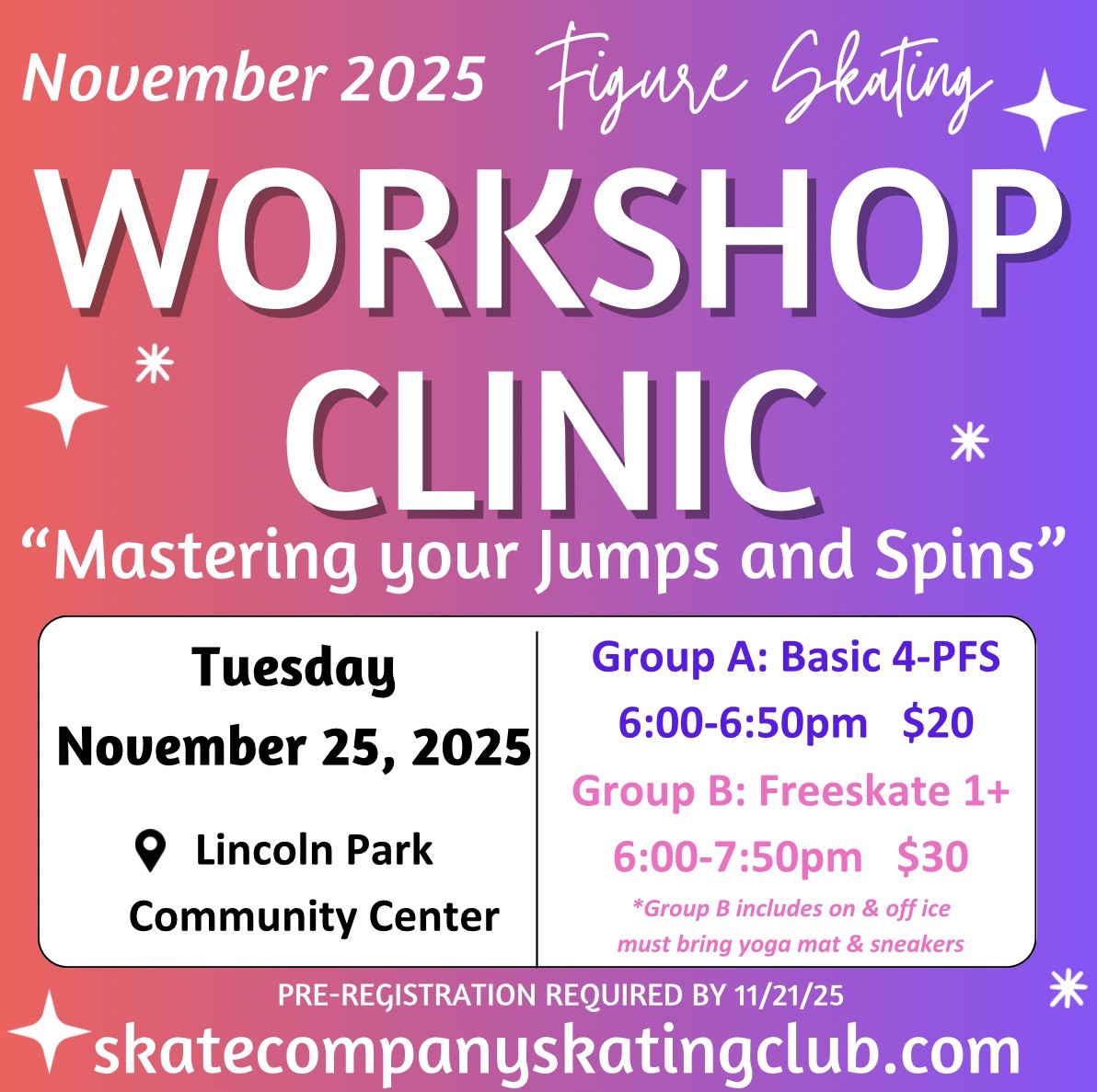 Skate Company skaters are invited to join us on November 25, 2025 for our “Mastering your Jumps and Spins” clinic at the Lincoln Park Community Center.