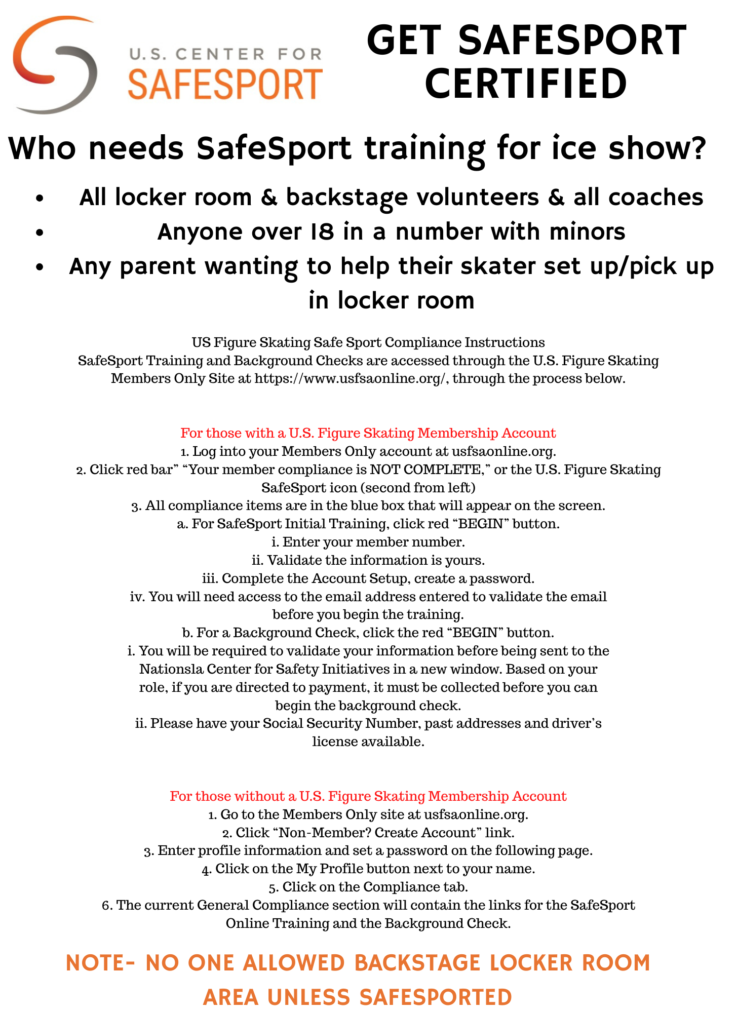 Questions regarding U.S. Figure Skating’s SafeSport Program can be directed to SafeSport@usfigureskating.org or 719-635-5200.