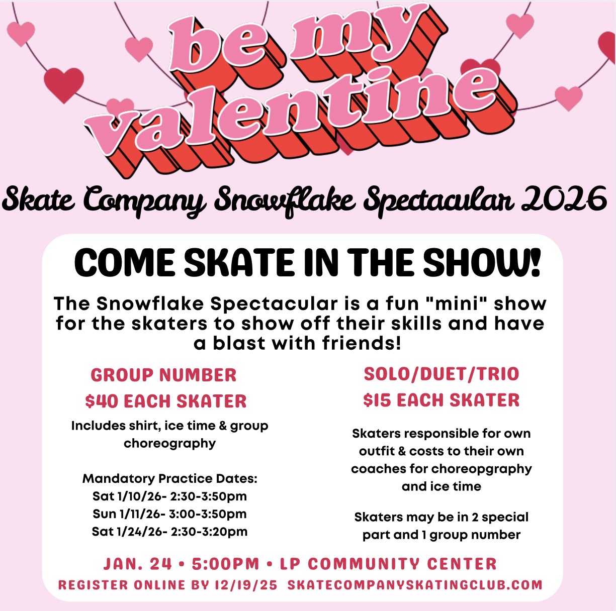 Join us for the 2026 Snowflake Spectacular – Be My Valentine! Skate Company skaters are invited to participate in our show once again this year! The show will be on Saturday, January 24, 2025 at 5 p.m.